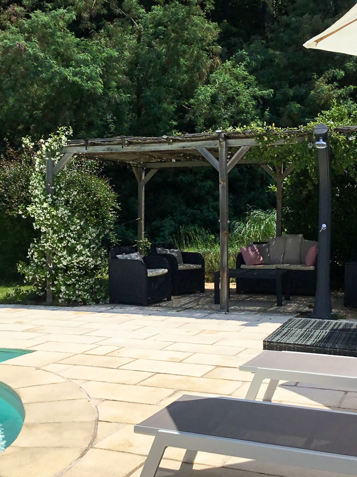 The pool house chalet is a tiled roofed summerhouse, with electricity and lighting.